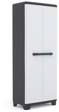 A szekrény erős, könnyű és ellenálló műanyagból készült. A három állítható polc lehetővé teszi a belső tér testreszabását a tárolt tárgyak méretéhez. A középre helyezett ergonomikus kék fogantyúk kényelmes nyitást biztosítanak még teljes terhelés mellett is.